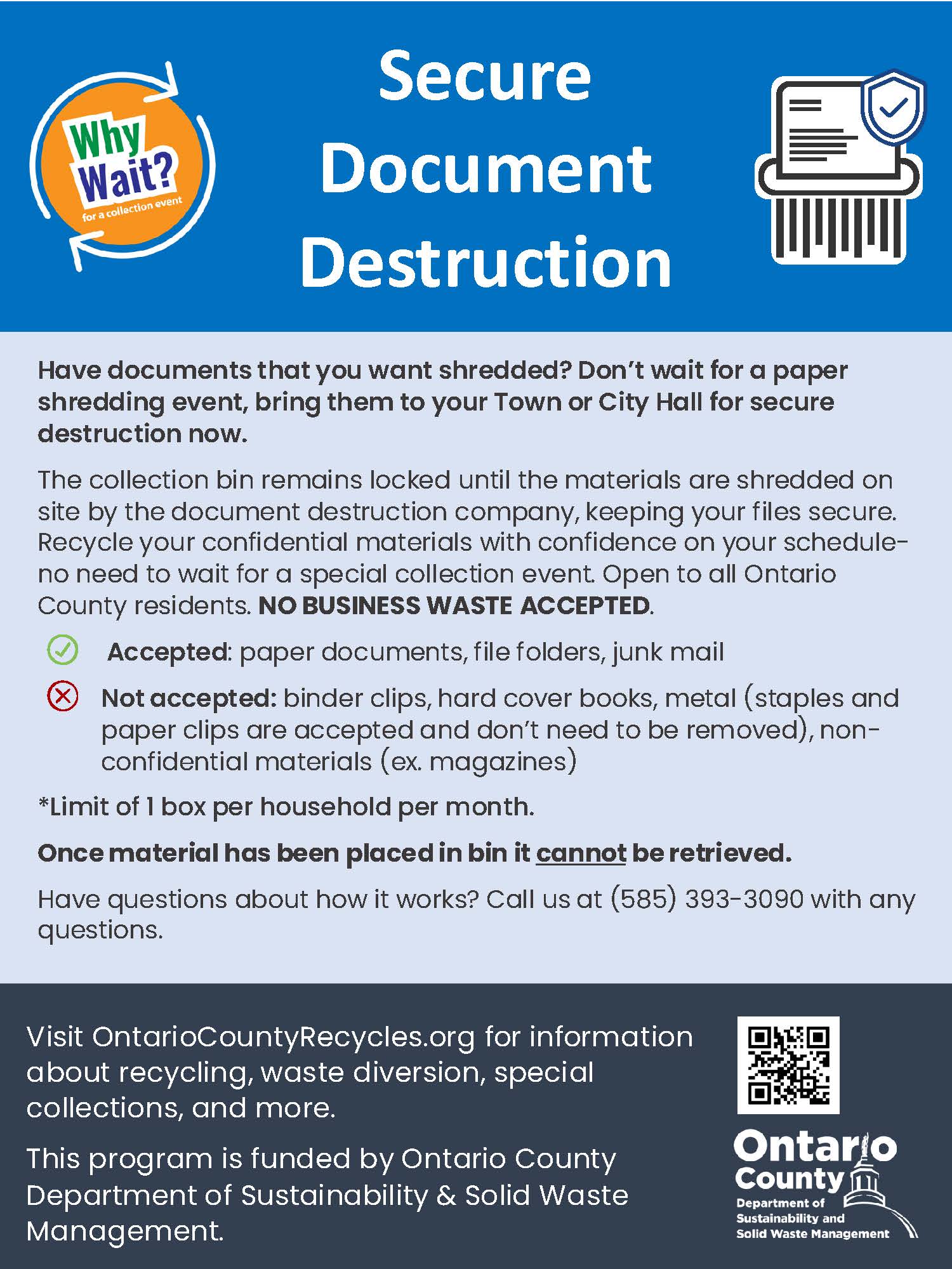 The collection bin remains locked until the materials are shredded on site by the document destruction company, keeping your files secure. Recycle your confidential materials with confidence on your schedule - no need to wait for a special collection event. Open to all Ontario County residents. NO BUSINESS WASTE ACCEPTED.
