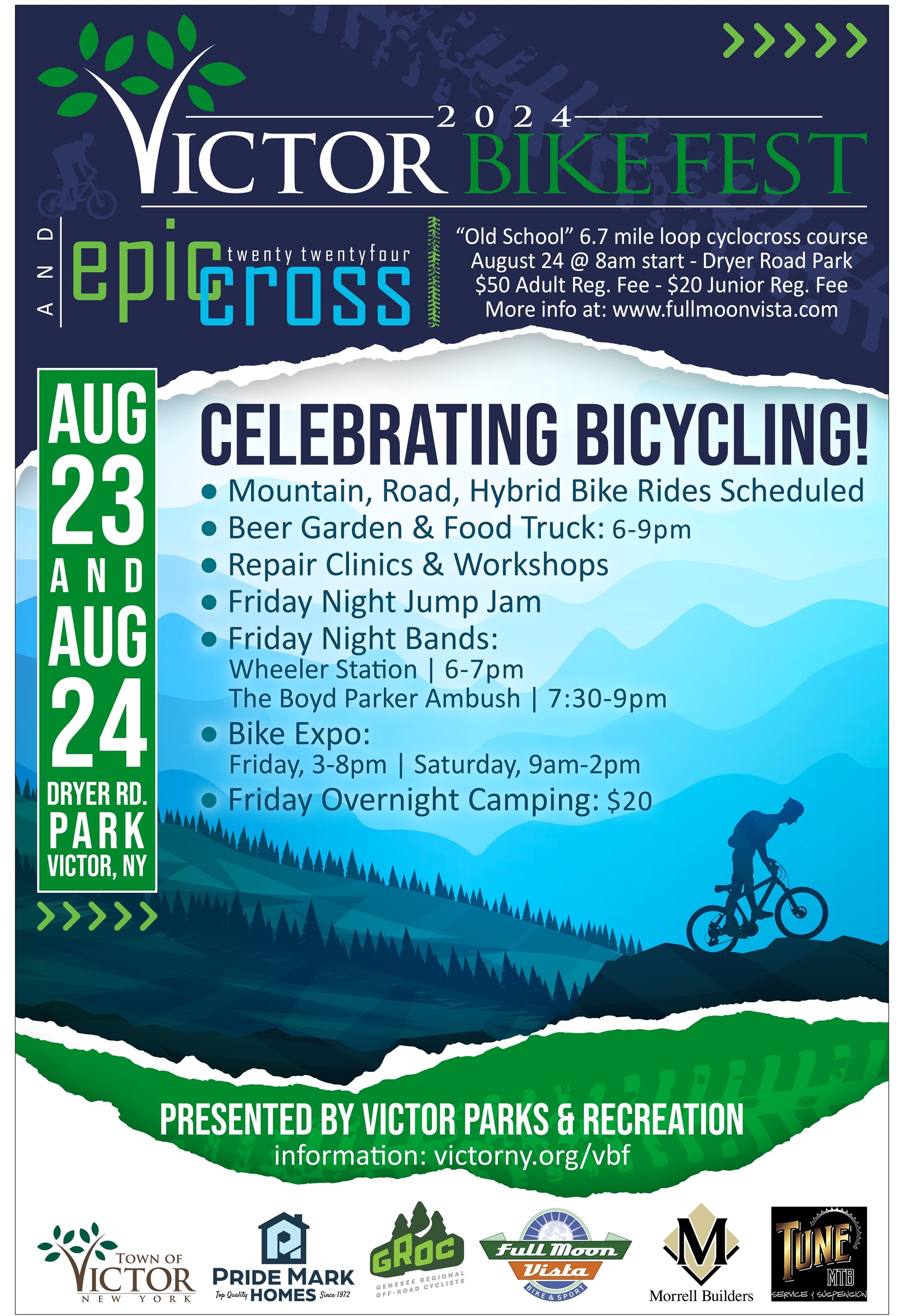August 23 & 24 at Dryer Road Park. Friday will feature music, food, beer & wine, ice cream & tons of bike events, vendors, and camping. Saturday will feature Epic Cross Bike Race, bike scavenger hunt, workshops, repair clinics, food, & more!